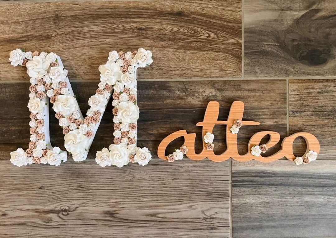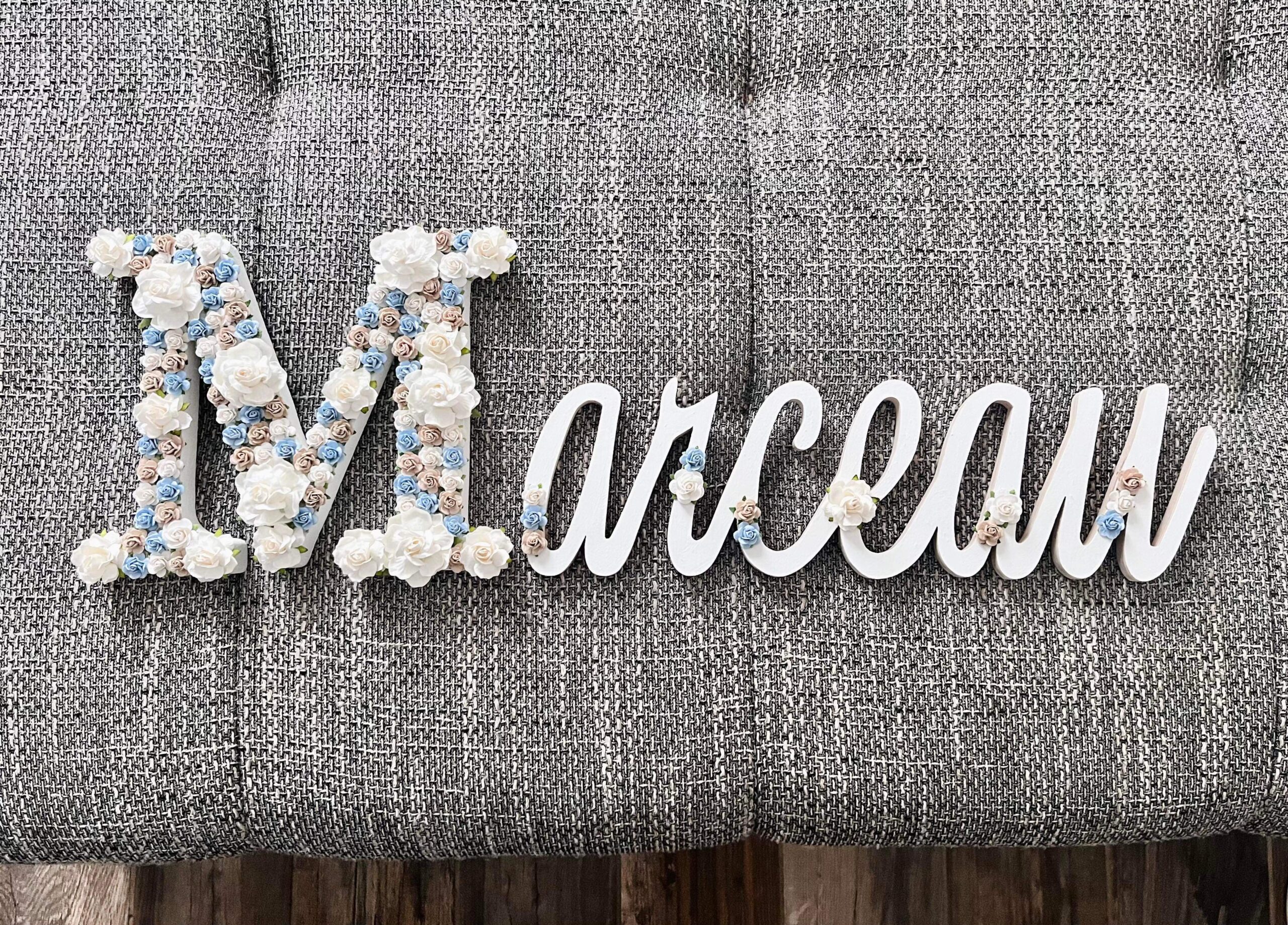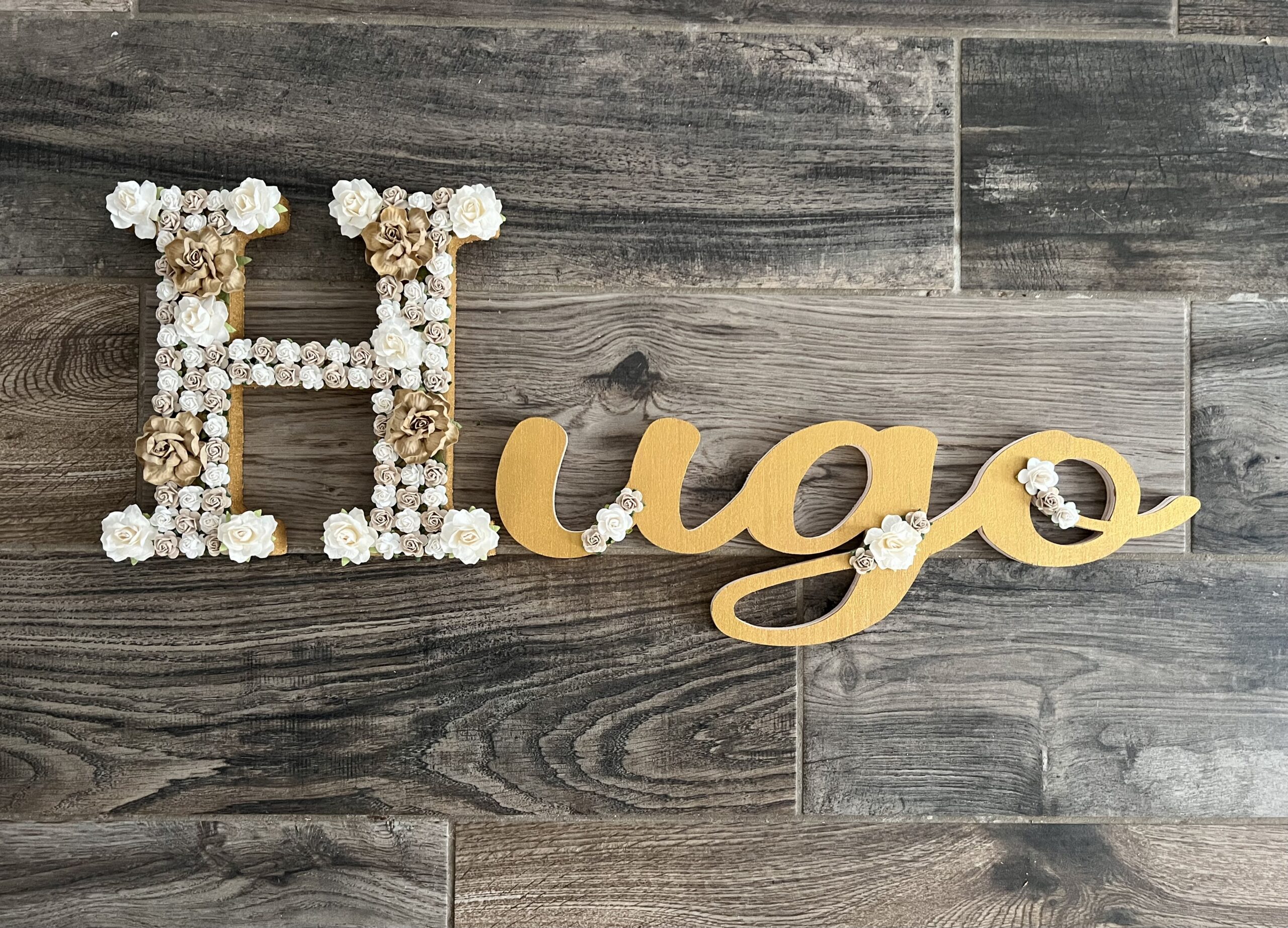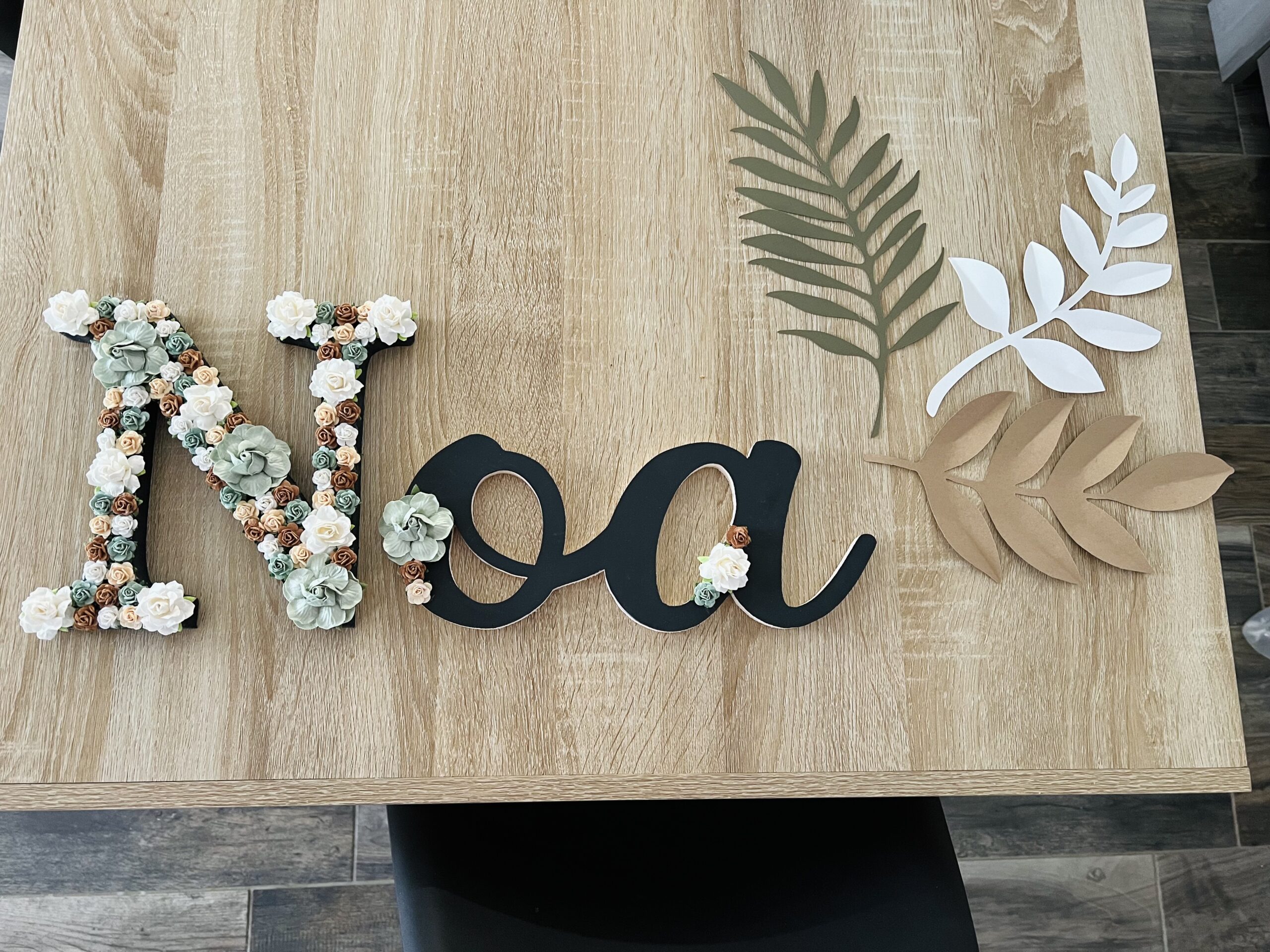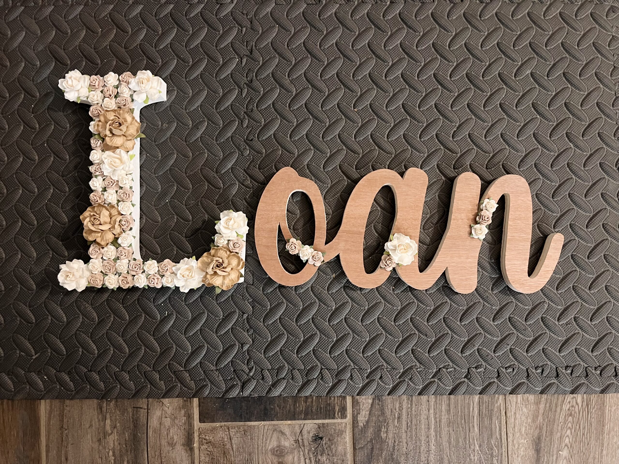 Le bois utilisé pour les initiales fleuries est du MDF et repeins en blanc par mes soins avant la mise en place des petites fleurs une par une. Le reste du prénom est du bois contreplaqué.