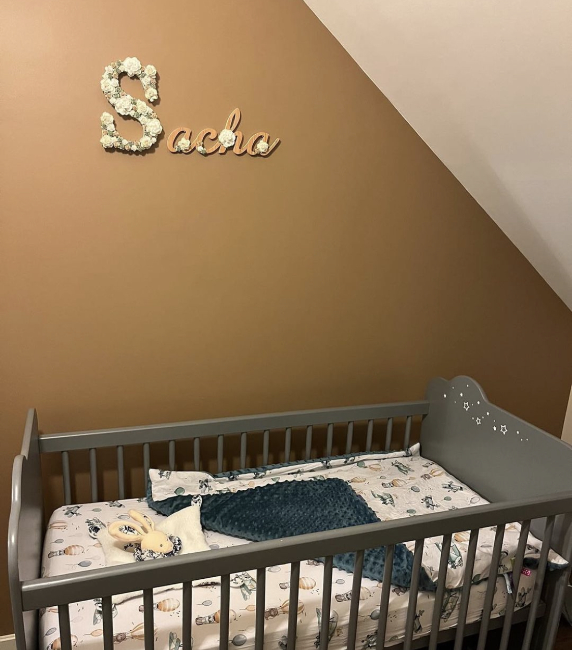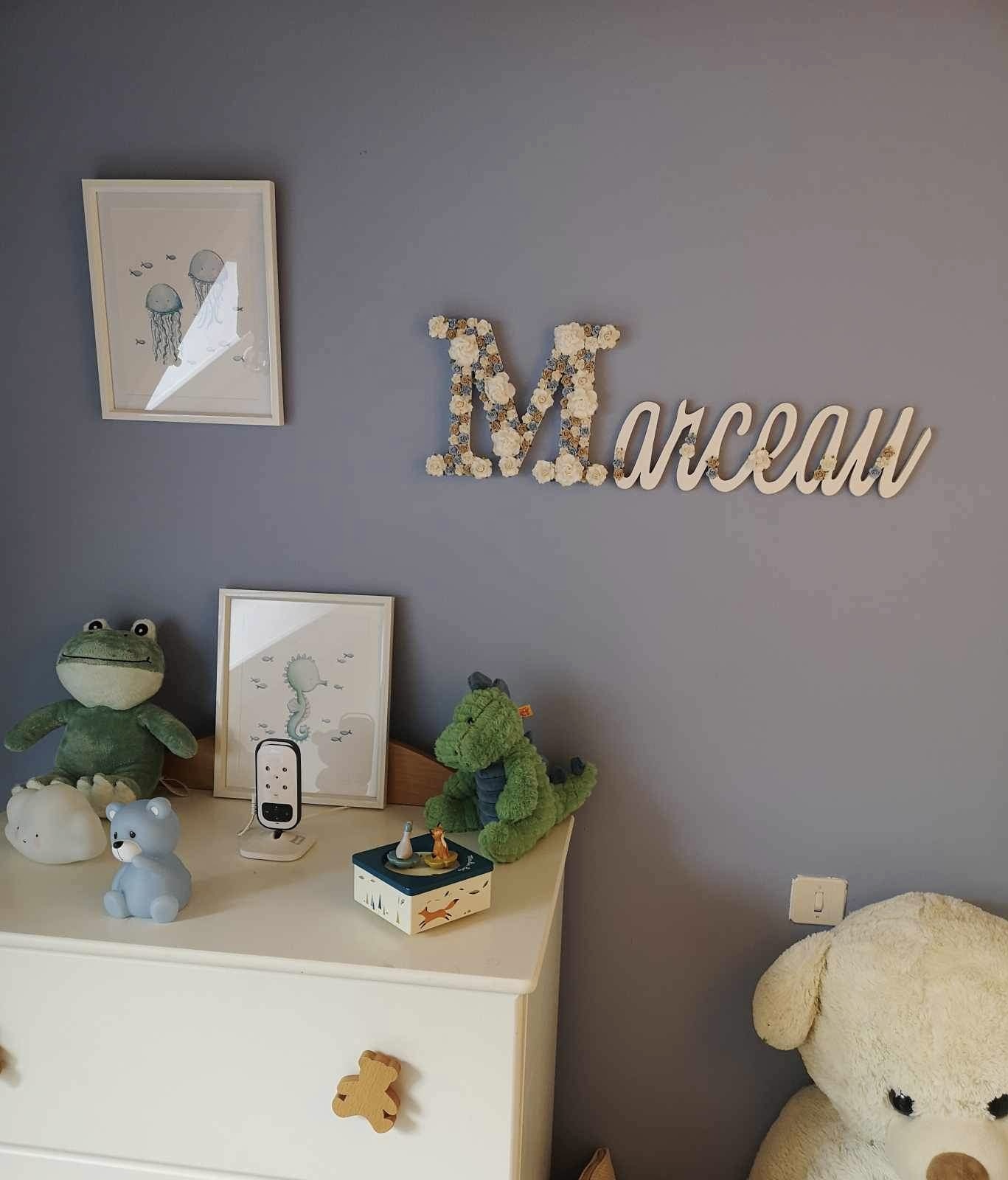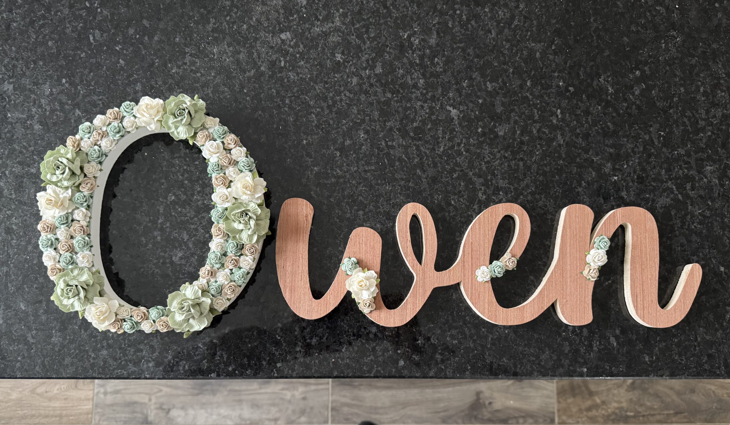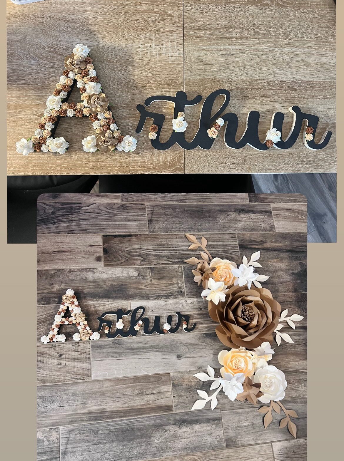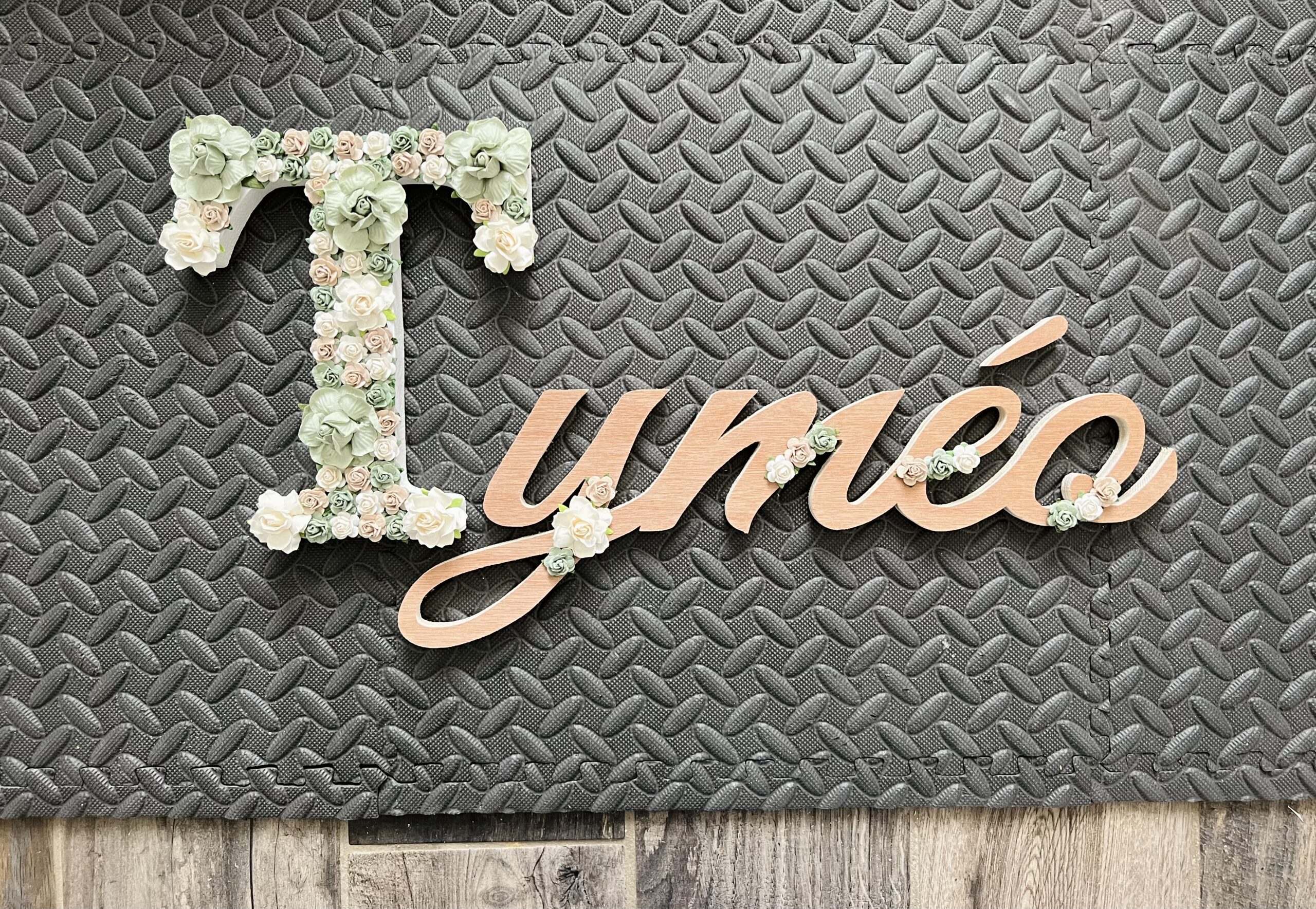 Le bois utilisé pour les initiales fleuries est du MDF et repeins en blanc par mes soins avant la mise en place des petites fleurs une par une. Le reste du prénom est du bois contreplaqué.